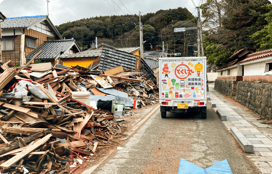 2024年1月1日に発生した能登半島地震を受け、とくし丸は1月7日より被災地での支援活動を開始。経済産業省や石川県珠洲市と連携し、避難所や自宅避難中の方々へ食品・衣料品を届けました。冷蔵庫搭載の軽トラックは常温・冷凍・日用品まで幅広く運搬でき、細い路地の多い住宅地にも適応。さらに全国に配備されたレンタカーを活用し、四輪駆動の車両で迅速に現地入りするなど、機動力を活かした支援が評価され、同年2月に総務大臣賞を受賞しました。