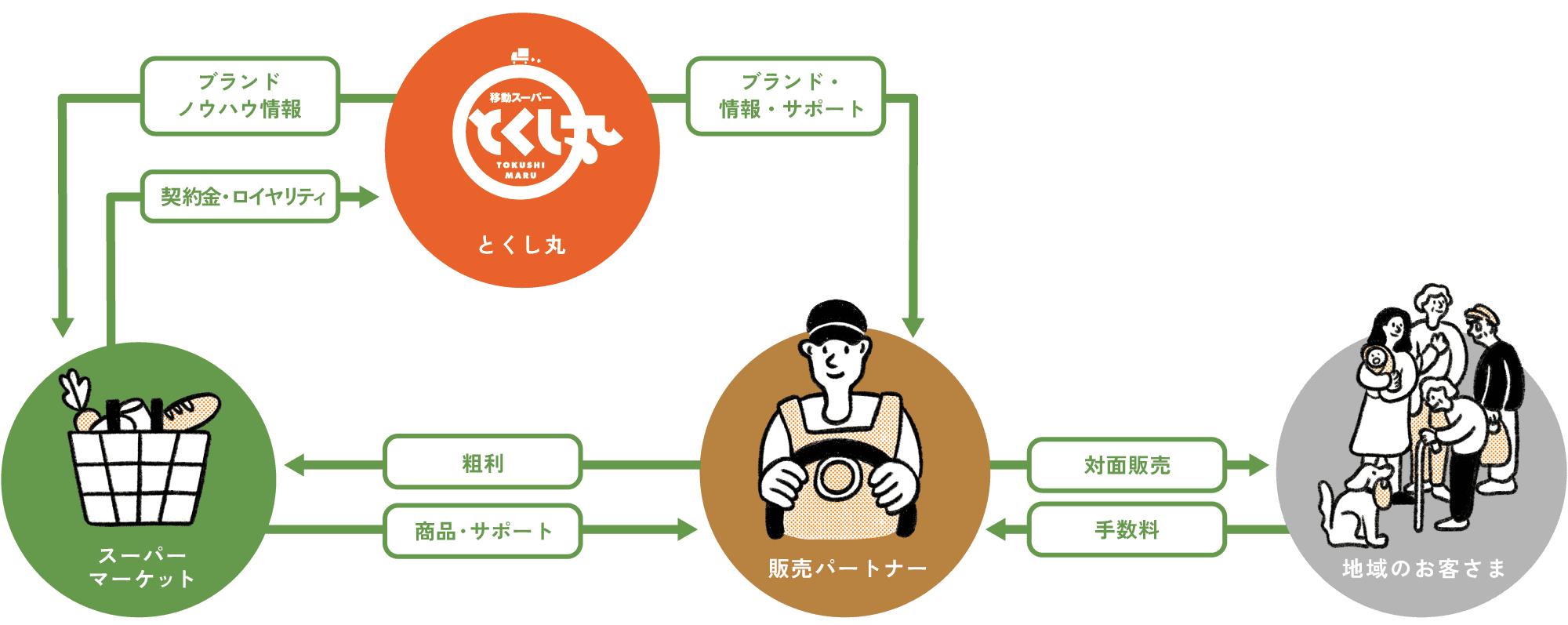 とくし丸の販売パートナーは、スーパーマーケットとの直接契約となります。日々の売上は、一度スーパーマーケットに預け、規定日にスーパーマーケットから販売パートナーの方々の指定口座に振り込まれます。