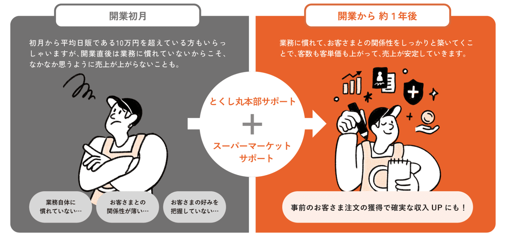 販売パートナーの方々の多くは、開業から1年程度で業務に慣れています。お客さまとの関係性をしっかり築いていくことで、客数・客単価も上がり、売上が安定していきます。